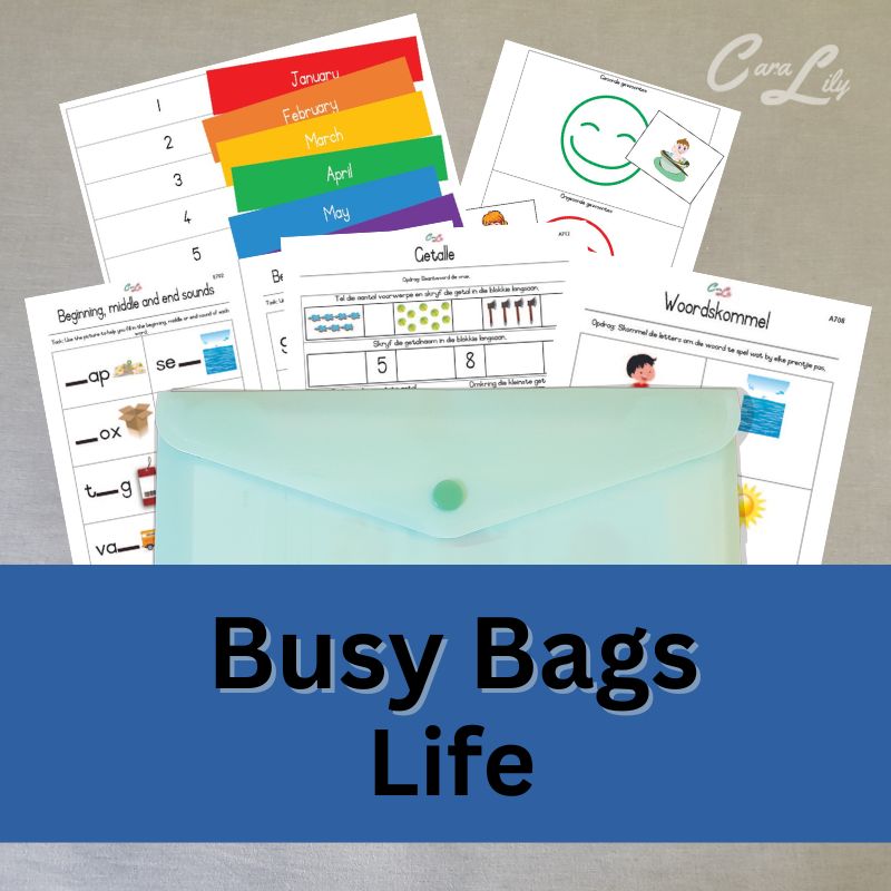 We offer busy bags that include 5 activities in one busy bag, which is perfect to take along on the road or to keep your child busy at the doctor’s office. Everything that your child will need to complete the activities, is included in the busy bag, no need for you to buy anything extra. It is simple activities stored in a bag so they are always ready to go! All our activities are designed to encourage early childhood development in ways that are fun and explorative.